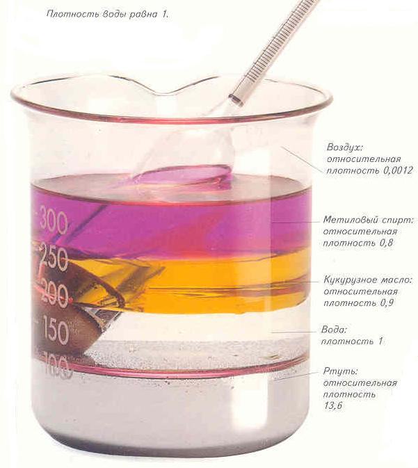 Щільність води дорівнює 1. Більш щільна рідина розміщується від водою, а менш щільна – над нею.