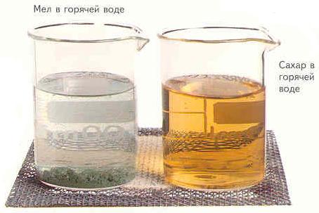 Крейда не розчиняється до кінця навіть у гарячій воді. А цукор у гарячій воді розчиняється набагато краще, ніж у холодній.