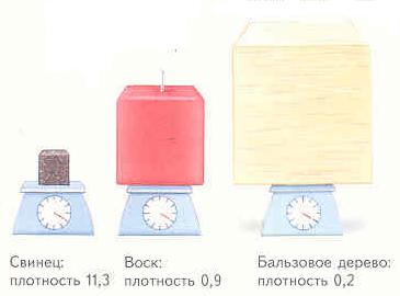 Свинець: щільність 11,3; віск: щільність 0,9; бальзове дерево: щільність 0,2.